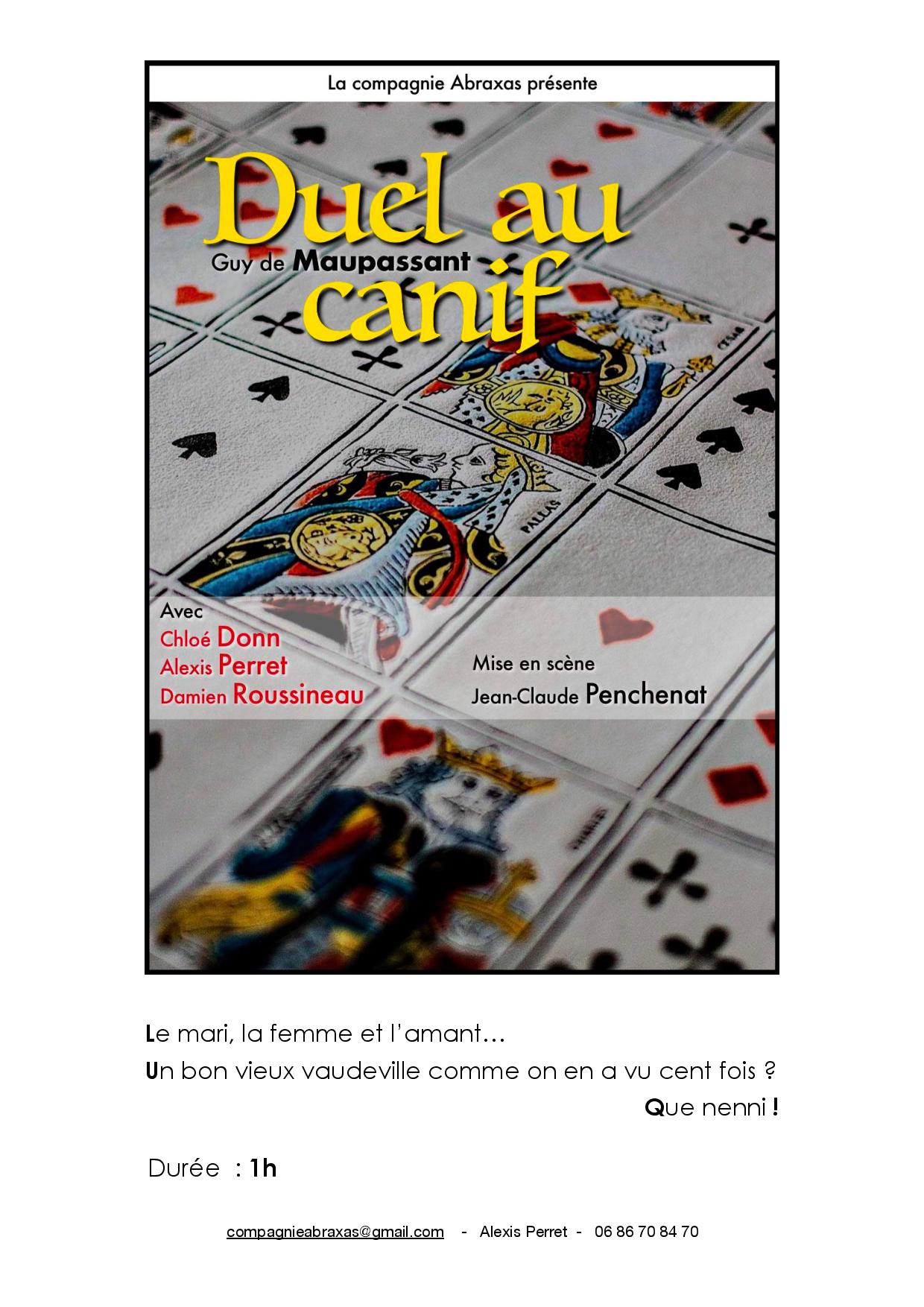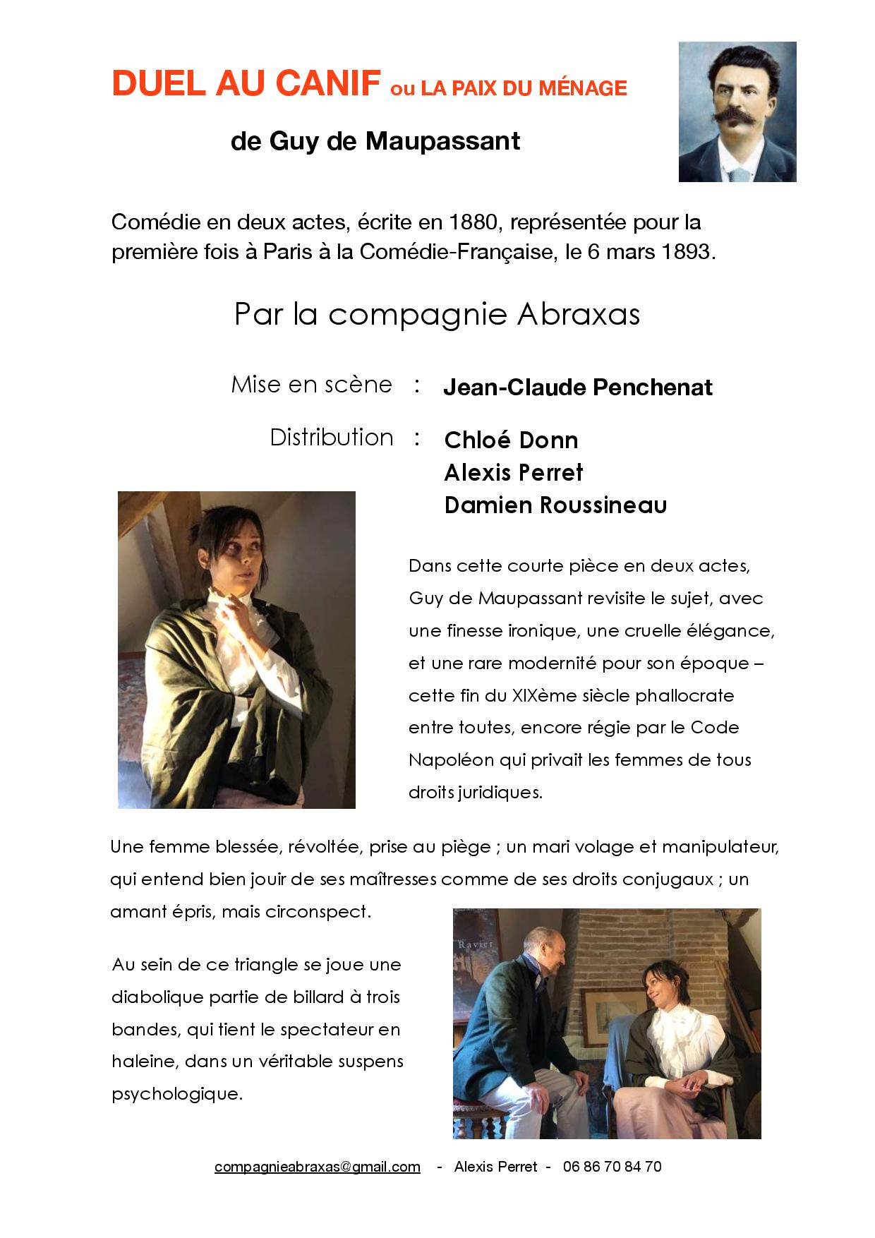 C’est avec Chloé Donn, Alexis Perret et Damien Roussineau que je répète actuellement la pièce de Maupassant dont je vous joint la fiche et qui pourra être représentée l’an prochain.